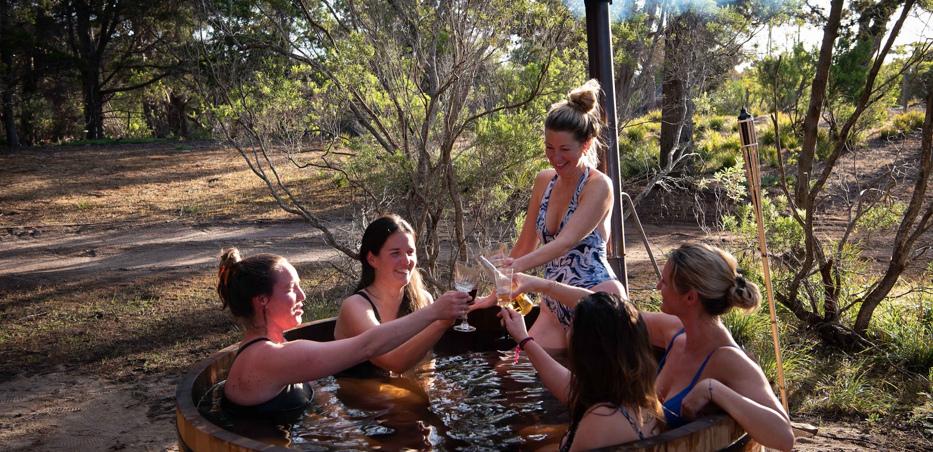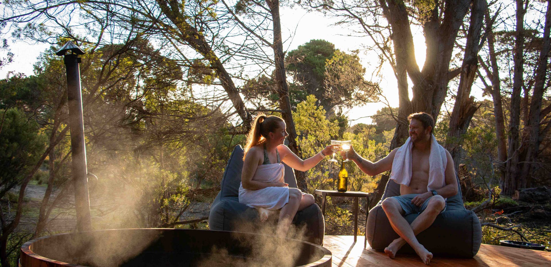 For those seeking a quick reset, private sessions lasting 1-3 hours are available, immersing you in pure forest therapy. Book a 2 hour Forest Flow contrast therapy ritual, cycling at your own pace through steam sauna, cold plunge and wood-fired hot tub. Sensory Forest Flow grounds you in the space with 1 hour of breathwork and forest bathing before your Flow Session. Sunset Forest Flow includes a platter and bottle of wine and 3 hours to enjoy the sacred pause. A 1-hour steam sauna session gives you ample time to rotate, relax and enjoy the forest views on the wrap-around decking. Feel the rhythm of the island as kangaroos graze nearby and bird calls echo through the trees.